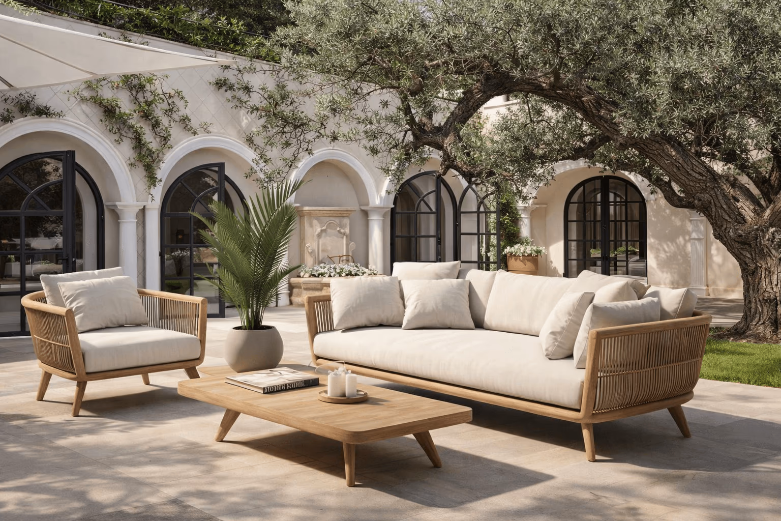 The Terra Collection is a refined range of outdoor seating and tables crafted in solid teak and woven textures, designed to bring warmth, balance, and timeless comfort to open-air living.