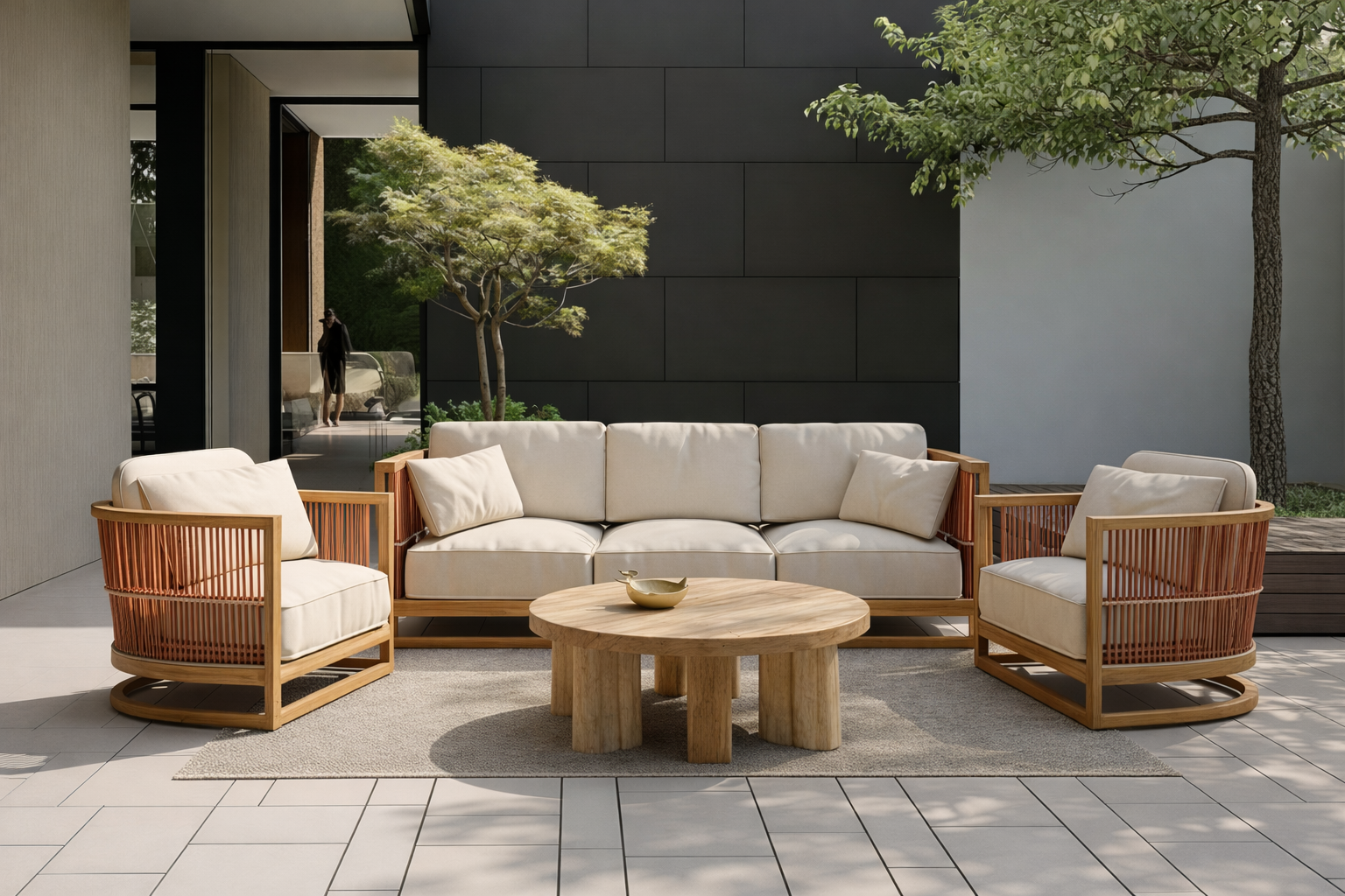 A luxury teak wood outdoor sofa set with plush weather-resistant cushions and handcrafted rope detailing, designed for serene, modern patios and premium outdoor living spaces.