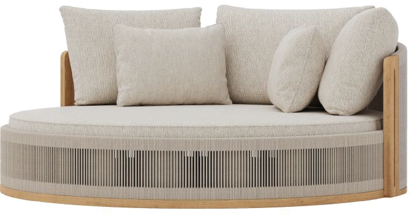 A circular teak-framed daybed with rope detailing and layered cushions. Its sculptural form makes it a signature centrepiece for terraces, patios, and gardens.