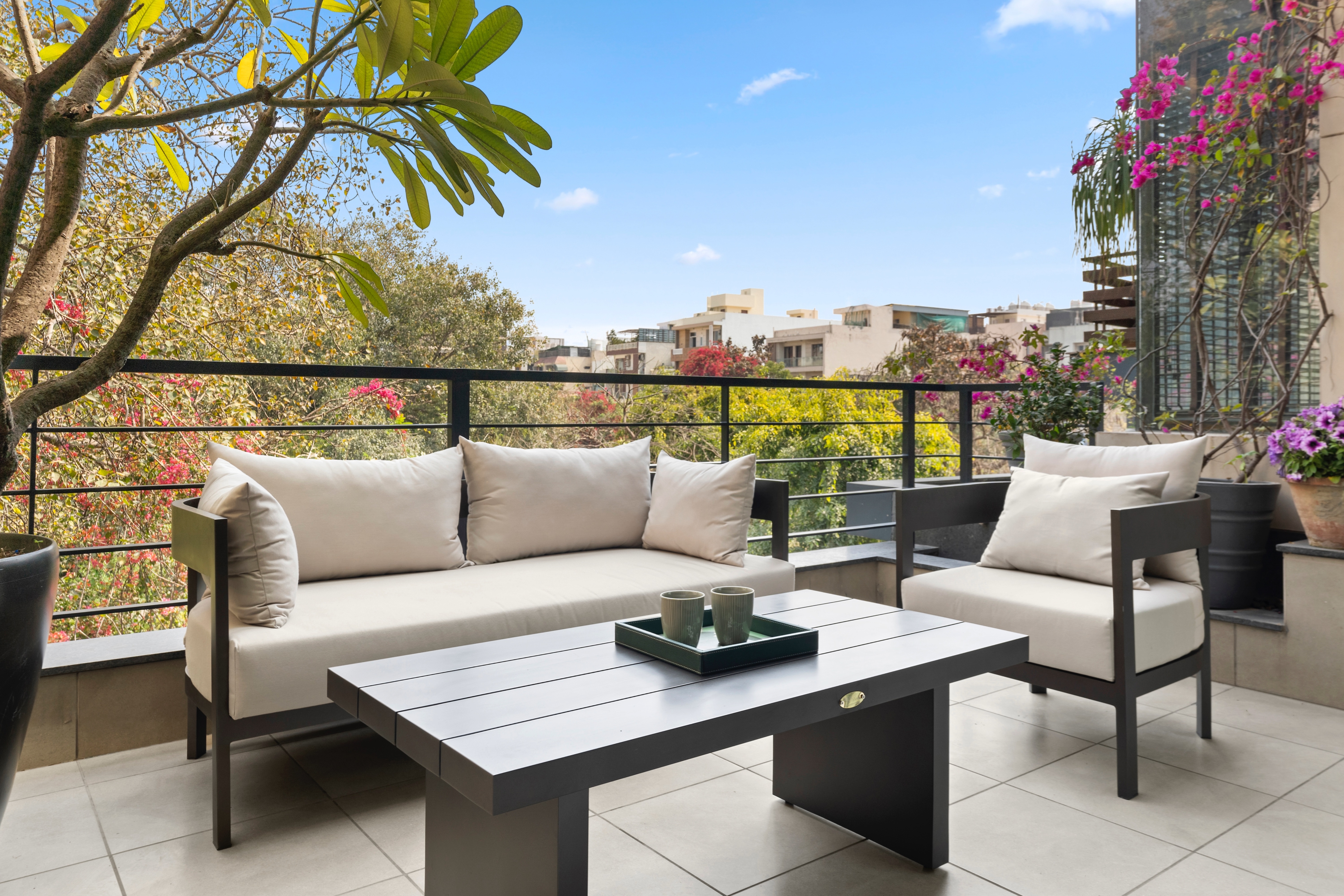 A sophisticated outdoor sofa seating featuring black framed furniture and lush greenery, perfectly blending contemporary design with serene city views.