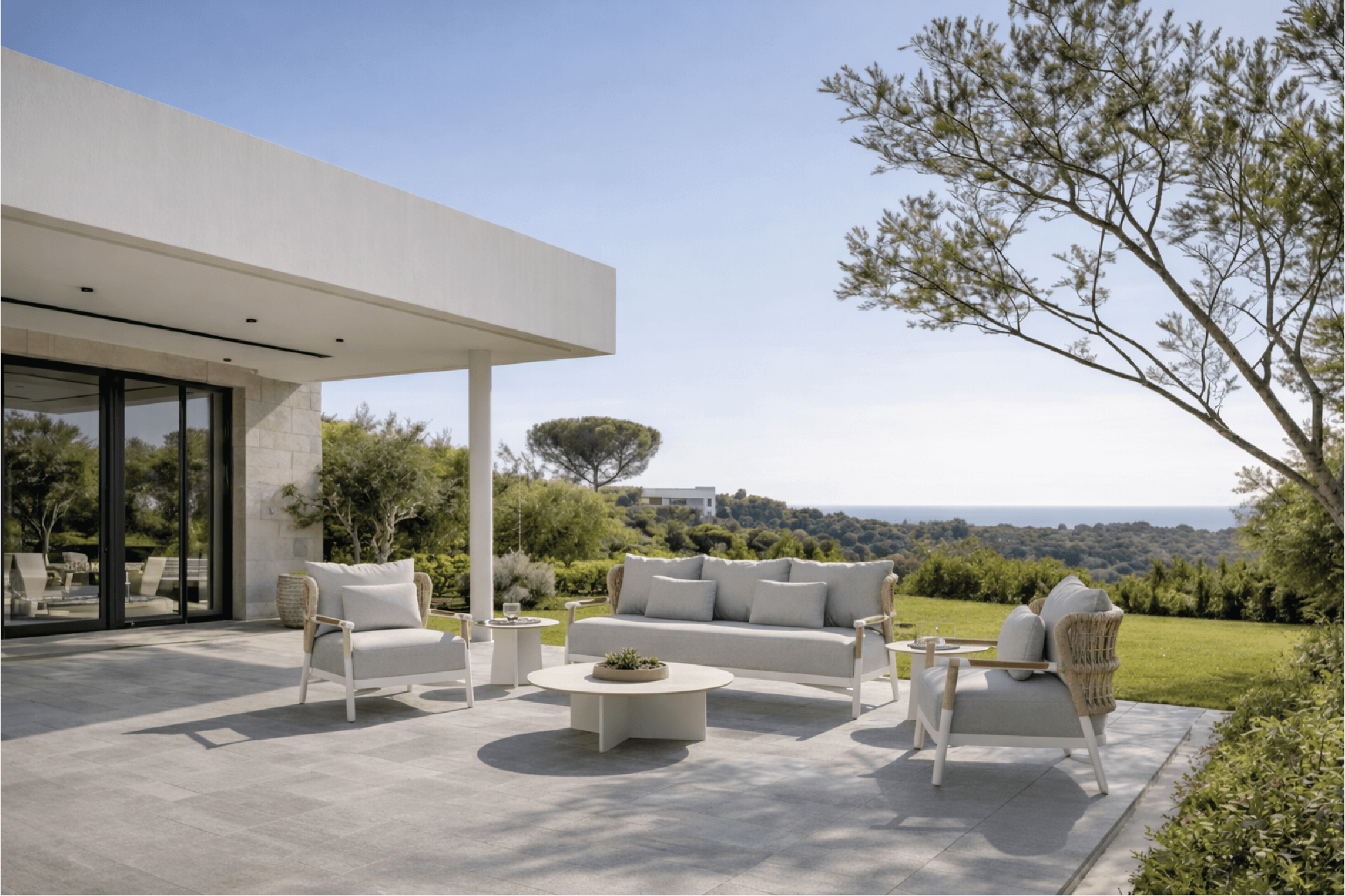Coastal serenity with clean lines, rope accents, and deep cushions. Transform your terrace into an elegant all-weather retreat with Amalfi.