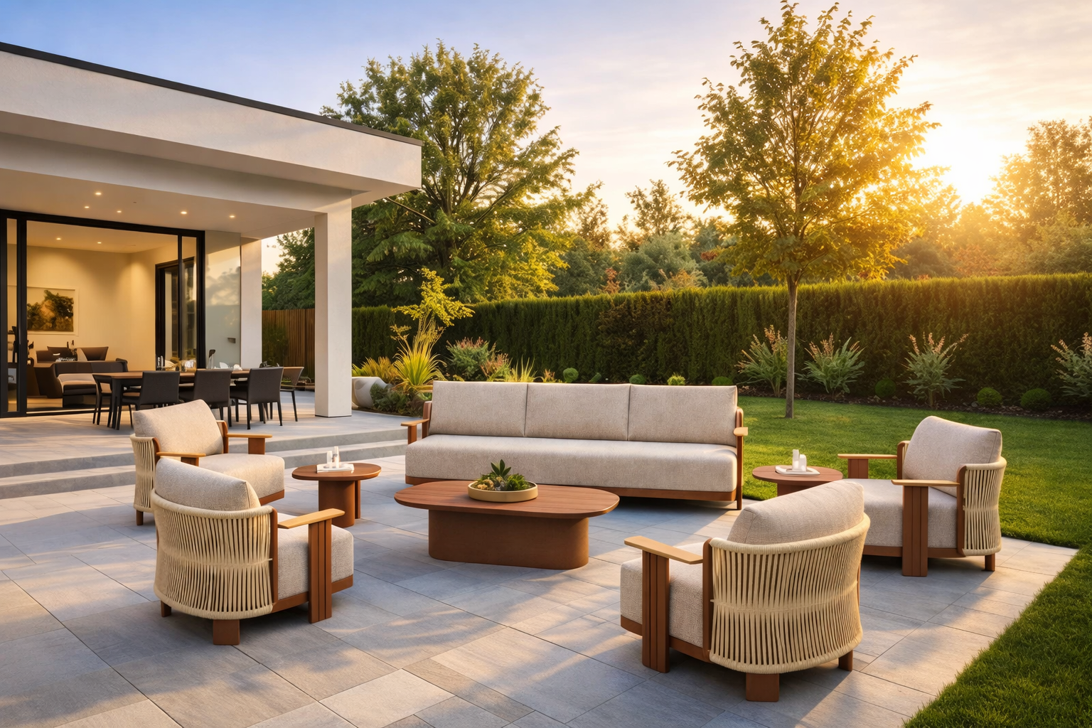Rope-detailed frames with plush all-weather cushions. Sculptural seating offering resort-like comfort for every season. View Fern Collection.
