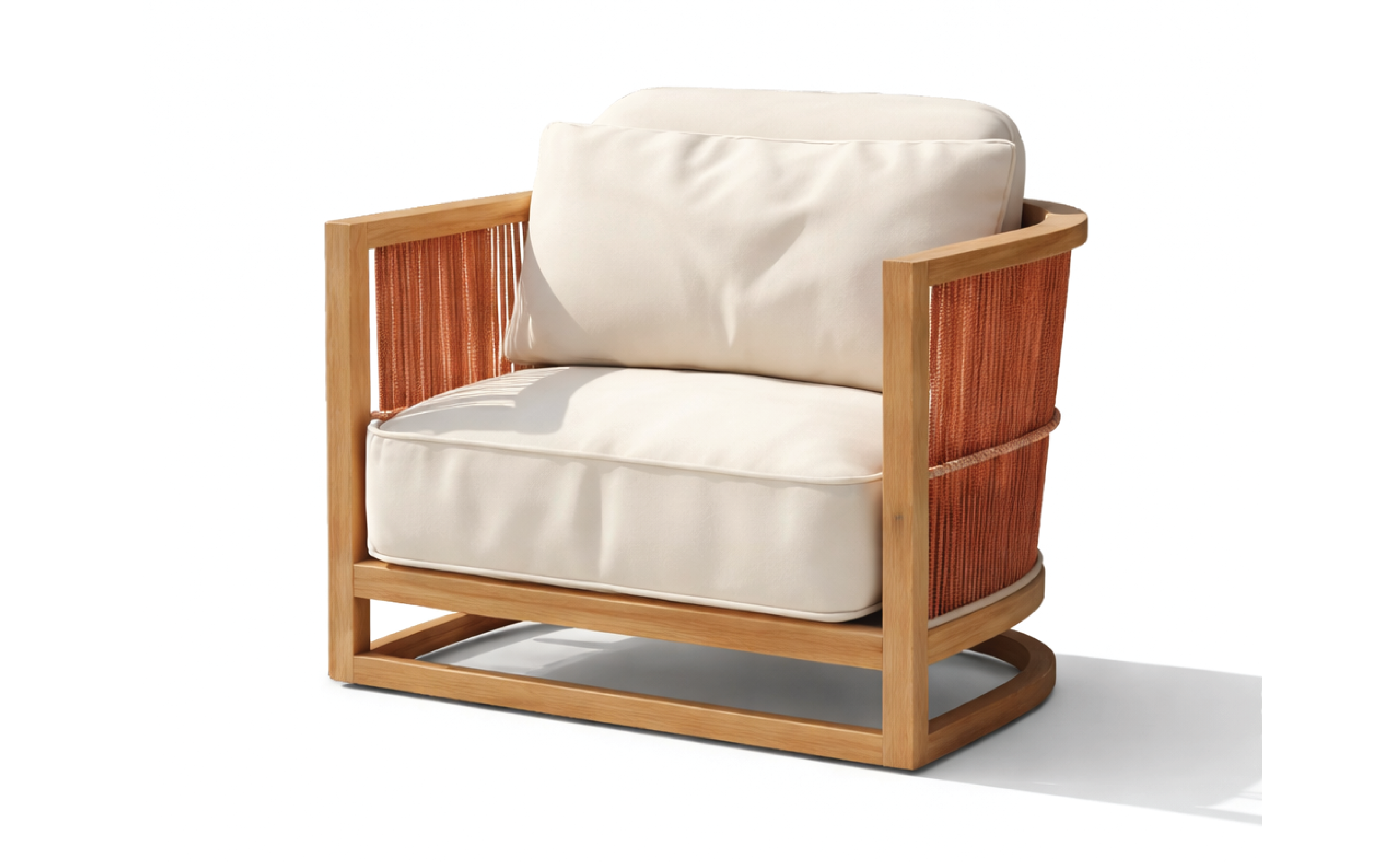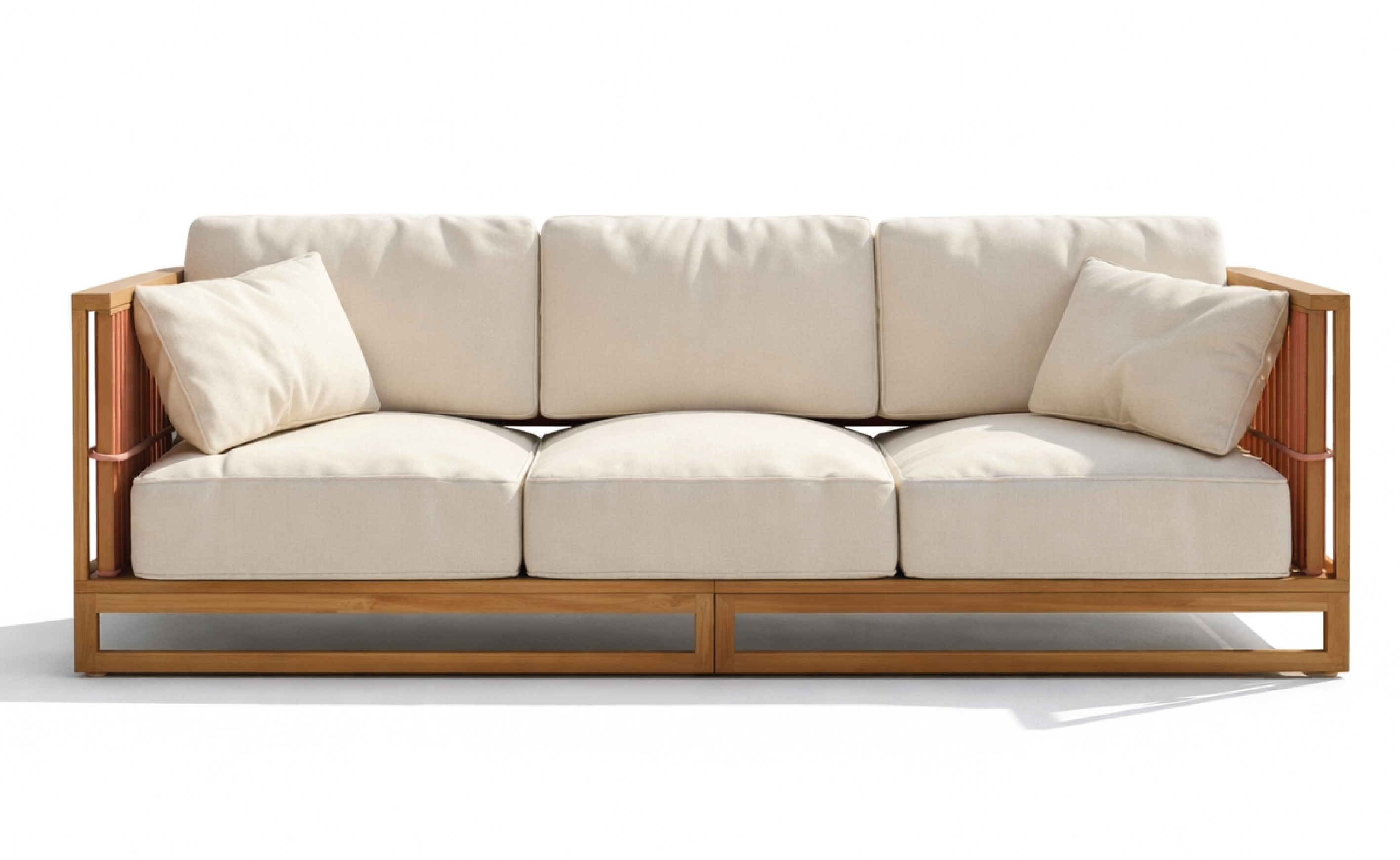 A luxury teak wood outdoor sofa set with plush weather-resistant cushions and handcrafted rope detailing, designed for serene, modern patios and premium outdoor living spaces.